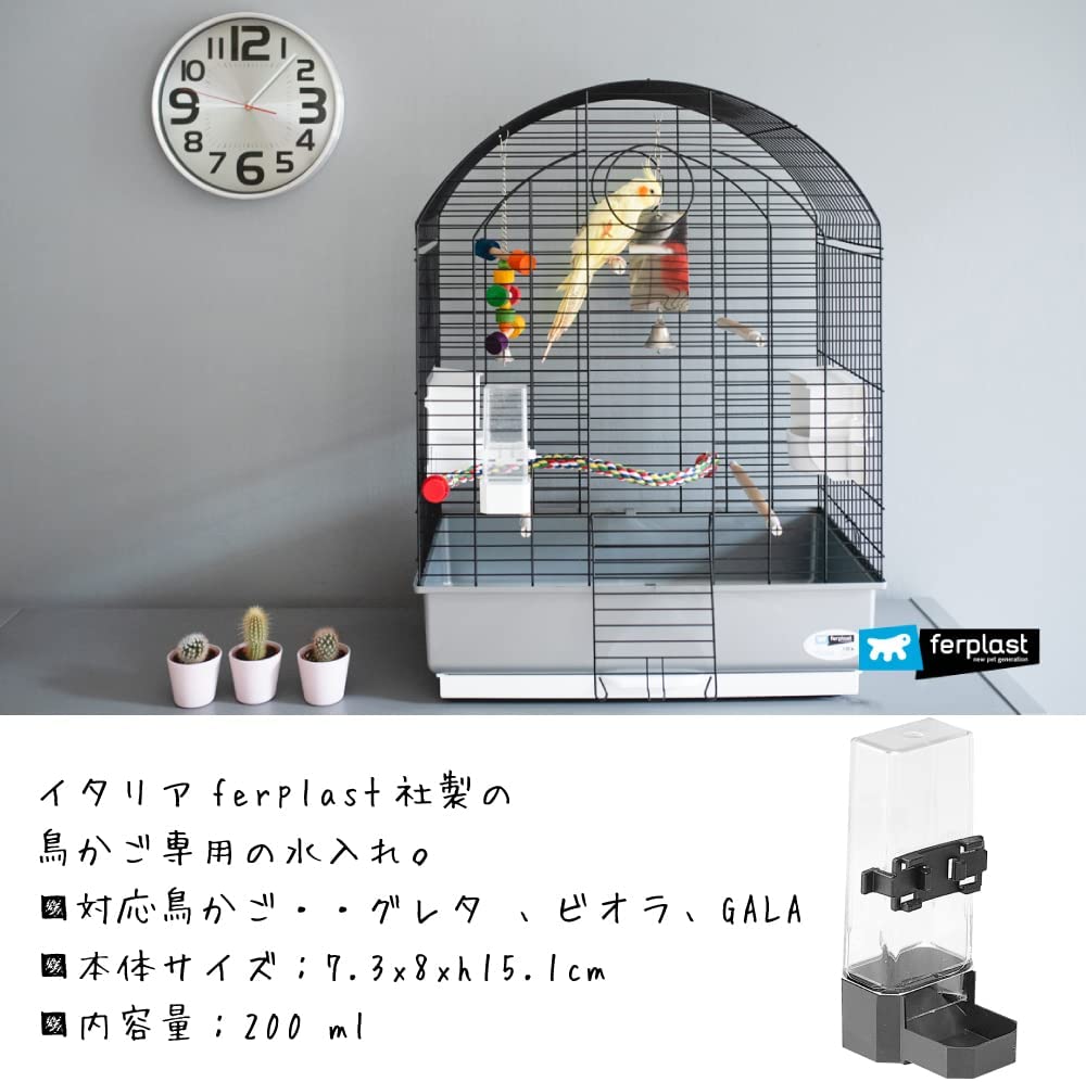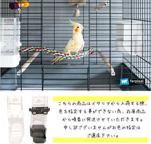 • Entirely made from plastic, it has a large base with a drinking point so that the bird can lean and drink in total quietness.