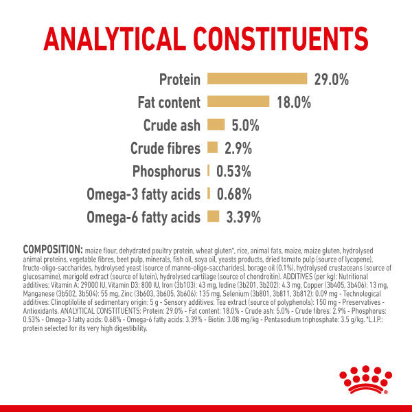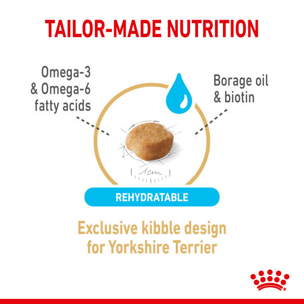 ROYAL CANIN® Yorkshire Terrier Adult 8+ is a breed-specific diet that is specially formulated to support adult Yorkshire Terriers over 8 years old. ROYAL CANIN® Yorkshire Terrier Adult 8+ contains a combination of antioxidants to help support healthy ageing, while the specially adapted phosphorus content helps to support kidney health. ROYAL CANIN® Yorkshire Terrier Adult 8+ is enriched with biotin, borage oil and fatty acids (Omega-3 and Omega-6) to support the health of your Yorkshire Terrier’s skin and coat. This product contains a blend of fibres and prebiotics, as well as highly digestible proteins to help support a good balance of intestinal flora for optimal digestive health and stool quality. This tailor-made kibble is highly palatable – its texture, shape, and size are specially adapted for mature Yorkshire Terriers and can be softened with warm water to make it easier to eat. To make sure that your dog gets a complete and balanced diet, be sure to follow the on-pack feeding guide.