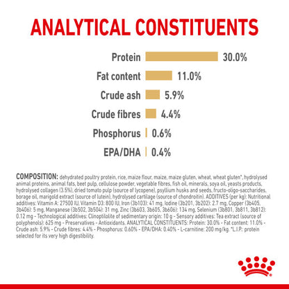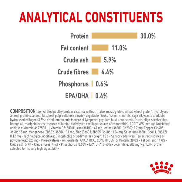 ROYAL CANIN® Labrador Retriever Adult 5+ is a specially formulated diet that is suitable for adult Labradors from 5 years old. ROYAL CANIN® Labrador Retriever Adult 5+ contains a combination of antioxidants that help support healthy ageing, and a reduced phosphorus content to support healthy kidney function. This formula has an adapted fat and calorie content to help mature Labrador Retrievers maintain an ideal weight, even though their activity level may have decreased. The inclusion of L-Carnitine also helps to support healthy muscle mass. This size, shape, and texture or the tailor-made kibble is specially adapted for mature Labrador Retrievers. ROYAL CANIN® Labrador Retriever Adult 5+ includes collagen, EPA and DHA to provide your dog with specific nutrients that help to support healthy bones and joints. To make sure that your dog gets a complete and balanced diet, be sure to follow the on-pack feeding guide.