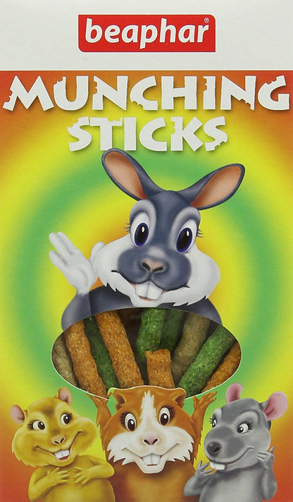 Beaphar Munching Sticks are a delicious treat for small animals. The extruded cereal sticks are made from natural ingredients and satisfy the need to gnaw.Beaphar Munching Sticks are a delicious treat for small animals. The extruded cereal sticks are made from natural ingredients and satisfy the need to gnaw. The sticks are typically 5cm long, allowing them to be fed through the cage bars, with less risk of fingers being nipped. All small animals will love them!