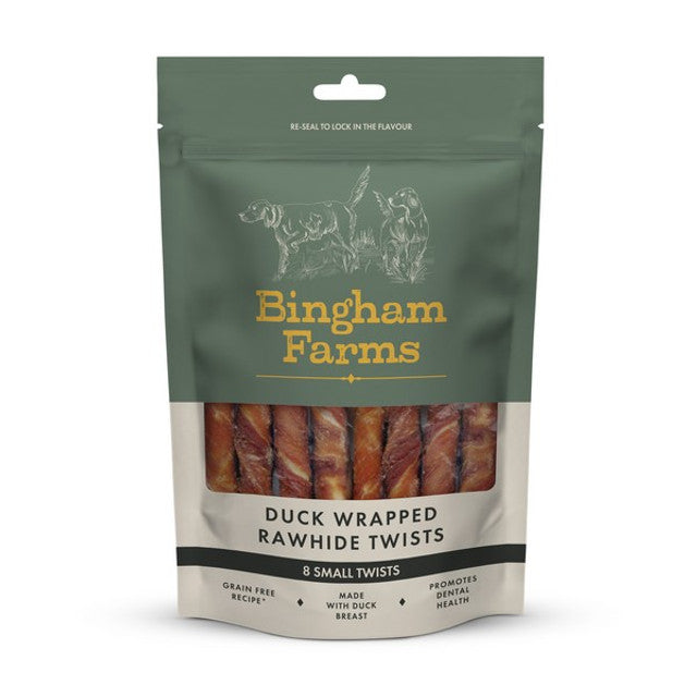 Bingham Farms Duck Wrapped Rawhide Twist Small 8 Pack (80g) combines the durability of natural rawhide with the rich flavor of real duck. These twisted chews provide a satisfying and flavorful chewing experience while promoting dental health.