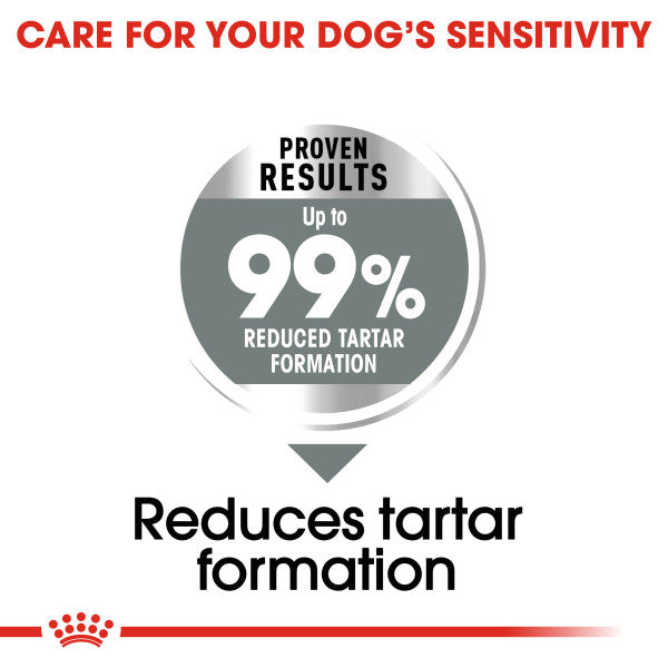 ROYAL CANIN® Medium Dental Care is specially formulated for medium-sized dogs with dental sensitivities. Suitable for adult dogs that weigh between 11kg and 25kg, this food’s exclusive nutritional profile is proven to support good oral health by helping to reduce tartar formation. • Complete and balanced nutrition • Helps to reduce tartar formation • Proven results • Special teeth-scraping kibble textureTaking care of your dog’s oral health plays a big part in their overall health and wellbeing. With the right diet, your dog can benefit from a variety of nutrients that help to stop tartar forming while also supporting good dental health. ROYAL CANIN® Medium Dental Care is exclusively formulated to cater for the nutritional needs of medium-sized dogs with dental sensitivities. This food is suitable for adult dogs that weigh between 11kg and 25kg. This kibble is tailor-made for medium-sized dogs like yours, with its size and shape specifically crafted to facilitate easy chewing and swallowing. What’s more, this kibble boasts an advanced texture that helps to scrape your dog’s teeth while chewing. Formulated with calcium chelators, this food also helps to stop the formation of tartar by binding the calcium in your dog’s food with the plaque on its teeth and thus slowing the formation of tartar. To further support your dog’s dental health, we advise taking your dog to the vet for regular dental checks and brushing their teeth every day with special canine toothpaste and a toothbrush designed just for dogs. At ROYAL CANIN®, everything we do is driven by our passion for pet health. Our Canine Care Nutrition range is the result of decades of advanced scientific research into developing tasty canine nutrition that supports your dog’s health! But don’t just take our word for it – this product’s results are proven. Tested in the Royal Canin kennels, this food helped to reduce the formation of tartar in medium-sized dogs by up to 99%.