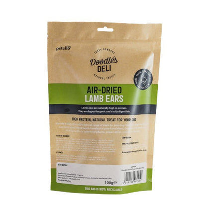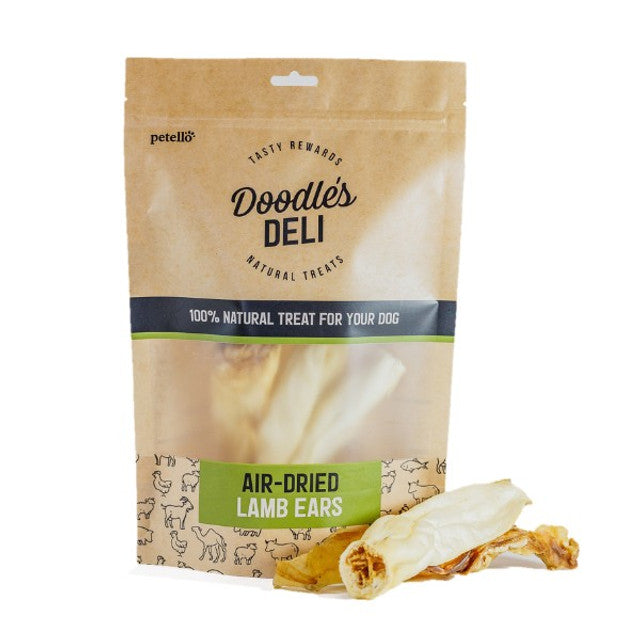 Doodles Deli Air Dried Lamb Ears Without Hair (100g) are natural, hypoallergenic chews made from 100% lamb ears. Gently air-dried to preserve nutrients and flavor, these light and easily digestible treats are perfect for dogs with sensitive stomachs or allergies to common proteins.