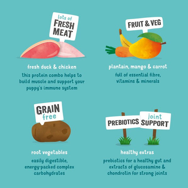 Edgard & Cooper's Duck & Chicken dry dog food is a grain-free recipe crafted for puppies. It features 40% fresh chicken and 10% fresh duck, providing high-quality protein to support muscle development. The formula includes glucosamine and chondroitin to promote joint health, along with prebiotics like MOS and FOS for digestive support. Enriched with fruits and vegetables such as plantain, mango, carrot, and peas, it offers a balanced diet for growing pups. The kibble is gently baked to retain nutrients and flavor. Packaging is recyclable and biodegradable, reflecting the brand's commitment to sustainability.