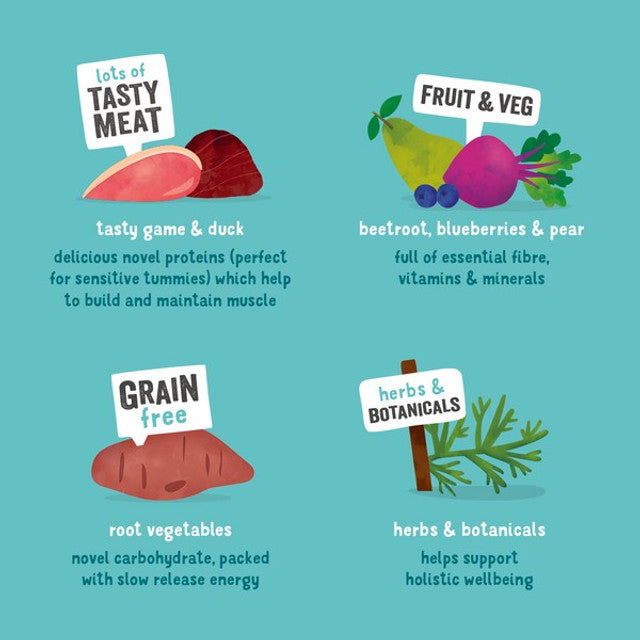 This rich and flavourful wet food features a blend of fresh game and duck, offering a high-protein, grain-free meal ideal for adult dogs. The recipe is packed with natural ingredients, including vegetables, fruits, and herbs, to support overall health and vitality. Gently steamed to lock in nutrients and taste, it’s a delicious and nourishing option for daily feeding.