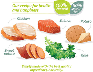 Chicken Breast with Salmon & Potato Chicken Breast (50%), Salmon 5%), cassava extract. Chicken Breast with Sweet Potato & Kale Chicken Breast (50%), Sweet Potato (5%), Kale (2%), cassava extract.