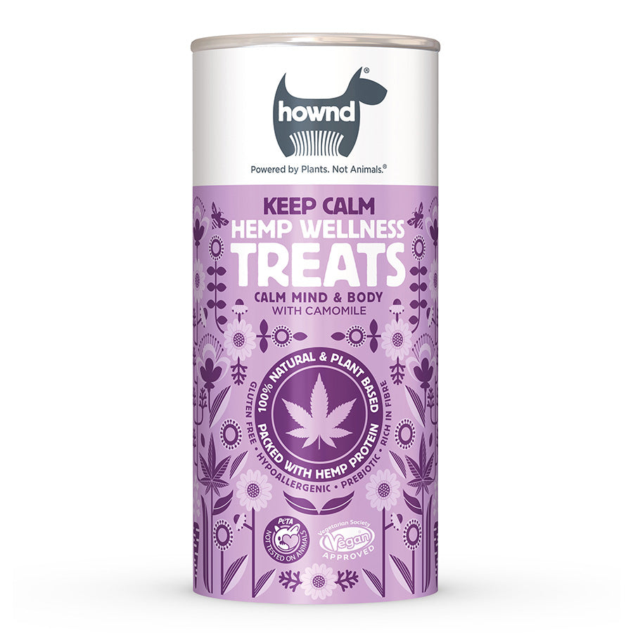 - Hownd Keep Calm Hemp Wellness Treats with added Camomile to help your best friend unwind. Camomile is also known to aid stress and anxiety. Ideal as a bedtime treat, or before a car journey or trip to the vet. Or simply just as a scrumptious treat. Keep Calm Hemp Wellness Treats are 100% natural, hypoallergenic, gluten free, and plant-based. All ingredients are sourced in the UK and produced in Devon. Organic Hemp is a complete source of protein and super rich in healthy fats: Omegas 3, 6 & 9 which are vital for optimal health of the skin. Hemp is super rich in minerals, and renowned for providing a myriad of natural health benefits. Accredited by the Vegetarian (Vegan) Society, PETA Not Tested on Animals, and the Ethical Company Organisation