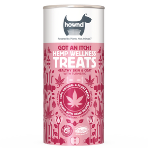- Hownd Got An Itch Hemp Wellness Treats 130g : With added Turmeric ÔÇô a magical herb containing the active compound curcumin which has antioxidant, anti-inflammatory, antiviral and antifungal properties. GOT AN ITCH? Hemp Wellness Treats are 100% natural, hypoallergenic, gluten free, grain free, human grade and VEGAN. All ingredients are sourced in the UK and produced in Devon. Organic Hemp is a complete source of protein and super rich in healthy fats: Omegas 3, 6 & 9 which are vital for optimal health of the skin. Hemp is super rich in minerals, and renowned for providing a myriad of natural health benefits. FEEDING GUIDE: HEMP WELLNESS TREATS are delicious and shaped liked mini cookies. Intended as a complementary pet food for dogs. Serve as a treat or reward. Suitable for puppies from 8 weeks. Feed 1-5 treats per day depending on your dogÔÇÖs size. Always ensure your dog has access to fresh clean water. Store in a cool, dry place. KEY BENEFITS:100% Natural Ingredients; Packed with Organic Hemp; Rich in minerals; Rich in Omegas 3, 6, 9; Rich in Fibre; Hypoallergenic; Vegetarian; Gluten & Grain Free; Oven Baked; Ethical Company Award. INGREDIENTS: SPLIT YELLOW PEA, HEMP (6%), APPLE, RAPESEED OIL, CARROT, TURMERIC (0.5%), INULIN (CHICORY ROOT EXTRACT) AND ADDED MINERALS