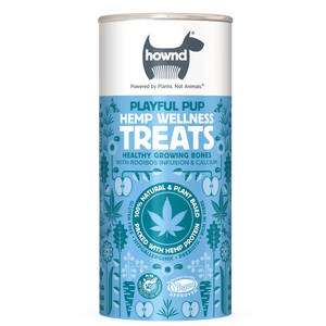 - Hownd Playful Pup Hemp Wellness Training Treats 130g : Rich in calcium for healthy bone development. With added Organic Rooibos Infusion (South African Red Bush Tea), best known for its antioxidant properties and free from caffeine, tannins and oxalic acid. PLAYFUL PUP Hemp Wellness Training Treats are 100% natural, hypoallergenic, gluten free, grain free, human grade and VEGAN. All ingredients are sourced in the UK and produced in Devon. Organic Hemp is a complete source of protein and super rich in healthy fats: Omegas 3, 6 & 9 which are vital for optimal health of the skin. Hemp is super rich in minerals, and renowned for providing a myriad of natural health benefits. FEEDING GUIDE: HEMP WELLNESS TREATS are delicious and shaped liked mini cookies. Intended as a complementary pet food for dogs. Serve as a treat or reward. Suitable for puppies from 8 weeks. Feed 1-5 treats per day depending on your puppyÔÇÖs size. Always ensure your dog has access to fresh clean water. Store in a cool, dry place. KEY BENEFITS: 100% Natural Ingredients; Packed with Organic Hemp; Rich in minerals; Rich in Omegas 3, 6, 9; Rich in Fibre; Hypoallergenic; Vegetarian; Gluten & Grain Free; Oven Baked; Ethical Company Award. INGREDIENTS: SPLIT YELLOW PEA, HEMP (6%), APPLE, RAPESEED OIL, KALE, CARROT, ROOIBOS (RED BUSH TEA) (0.5%), INULIN (CHICORY ROOT EXTRACT) AND ADDED MINERALS.