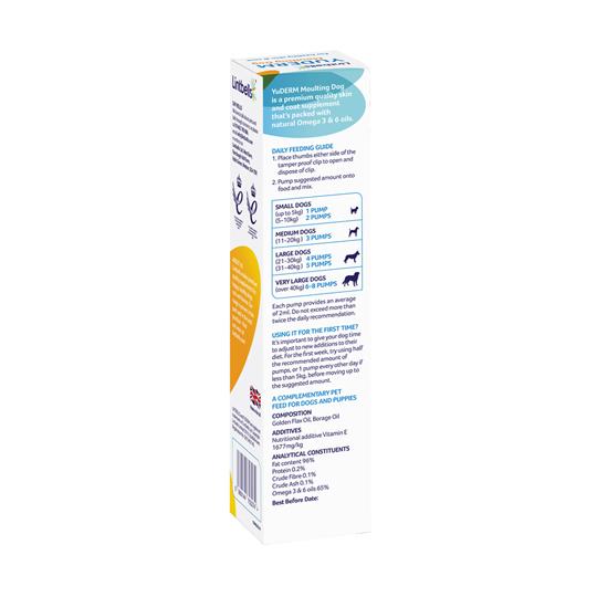 YuDERM Moulting Dog, previously YuMEGA Dog, is a premium quality coat and skin supplement that’s packed with natural essential Omega 3 and 6 oils. It is now available in a convenient pump bottle for easy administration. YuDERM Moulting Dog's premium cold-pressed Golden Flax and Starflower (Borage) oils are proven to reduce moulting and support healthy skin. It’s easy to use - just pump it onto your dog’s food and see the difference in as little as 4-6 weeks.