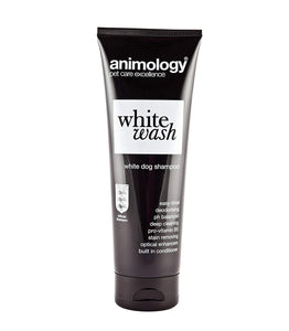Animology White Wash dog shampoo has been specially formulated to be suitable for all types of white dog hair. With built in optical whitening enhancers Animology White Wash delivers world class, dazzling white results. It has a mild yet deep cleaning action that removes dirt, odour and yellow staining without stripping the coat of its essential oils.