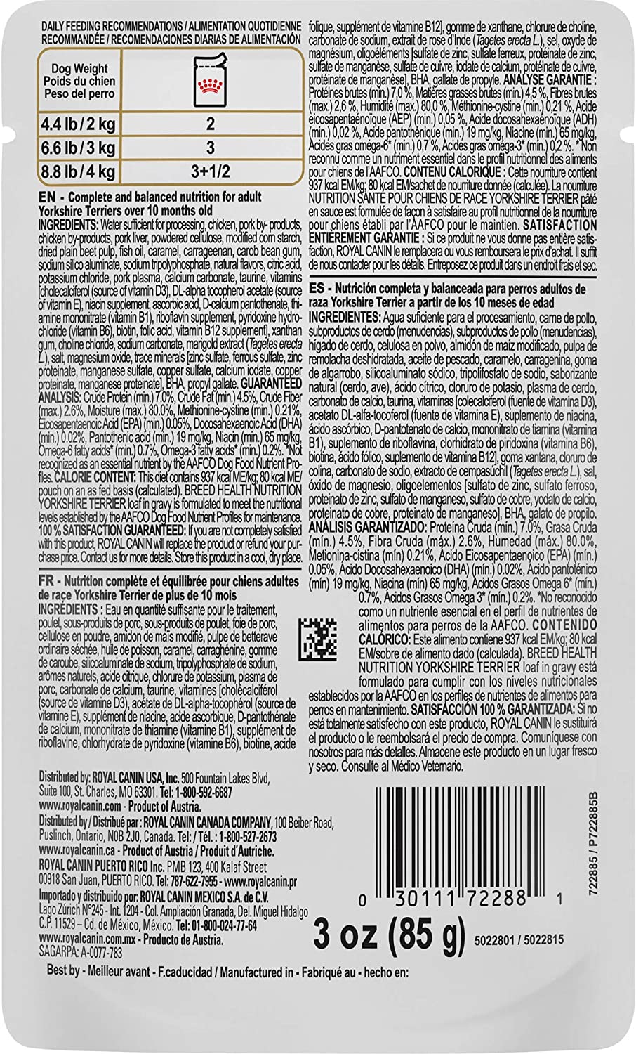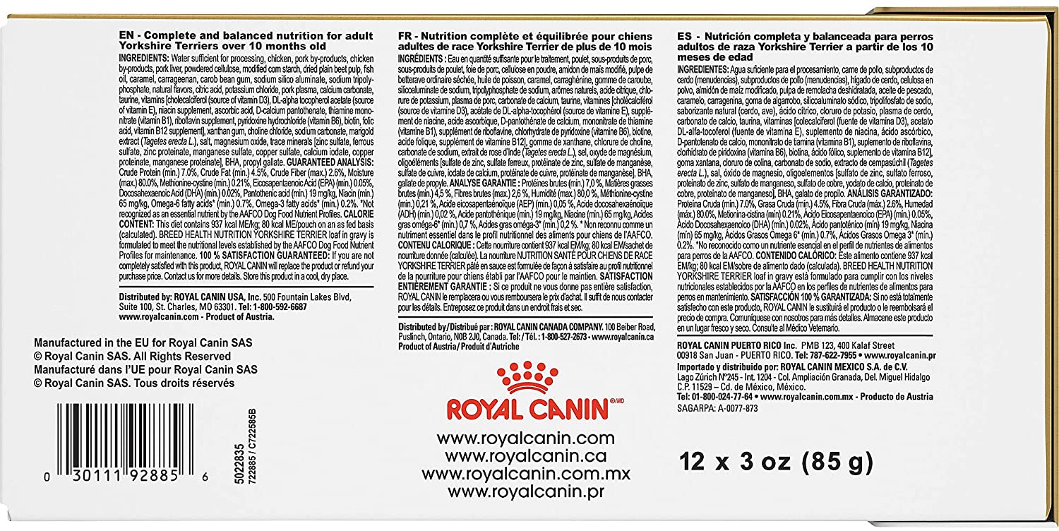 - FORMULATED FOR PUREBRED YORKSHIRE TERRIERS: Royal Canin Yorkshire Terrier Adult Wet Dog Food is designed to meet the nutritional needs of purebred Yorkshire Terriers 10 months and older