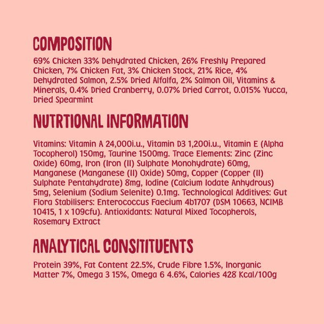 High-Quality Protein: Contains 4% freshly prepared salmon and 69% chicken, providing essential amino acids for muscle maintenance.