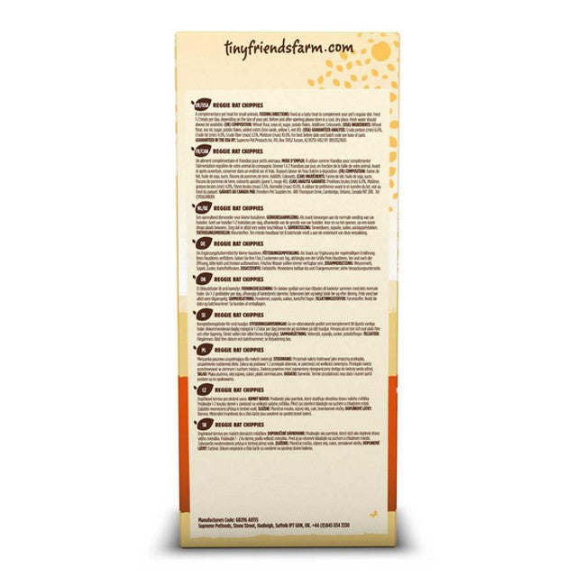 Supreme Tiny Friends Farm Reggie Rat & Mimi Mouse Chippies 120g are tasty, baked treats for rats, mice, rabbits, guinea pigs, hamsters, chinchillas, and gerbils. Made with wholesome grains and vegetables, these crunchy snacks promote dental health and foraging behavior. Perfect for hand-feeding, they strengthen pet-owner bonds without artificial additives.